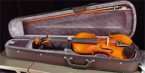 More attractive figured wood is used in this violin, and it is a good choice for the player looking for an instrument with more sound output and expressiveness. it has ebony fittings and fine appearance (fine antique style), with lightweight case and wood horsehair bow. Size available 14" - 16"1/2.